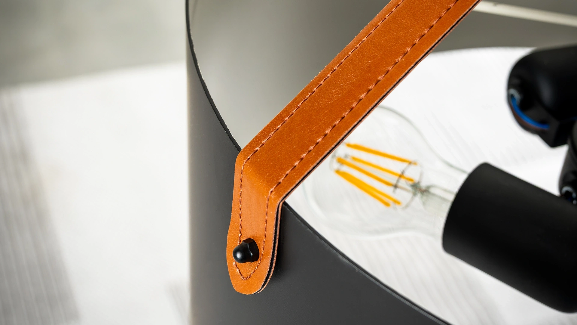 Deri detaylı metal gövdeli, siyah kumaş başlıklı şık TV tavan aydınlatması.