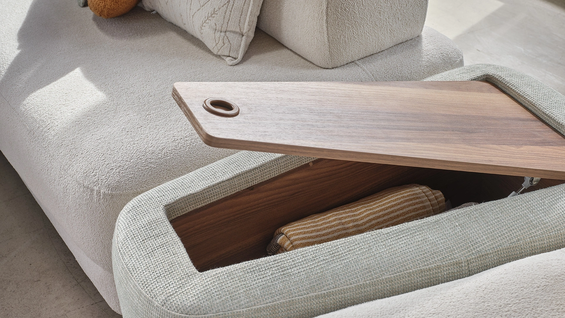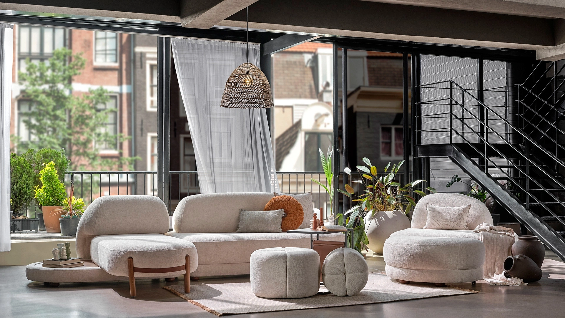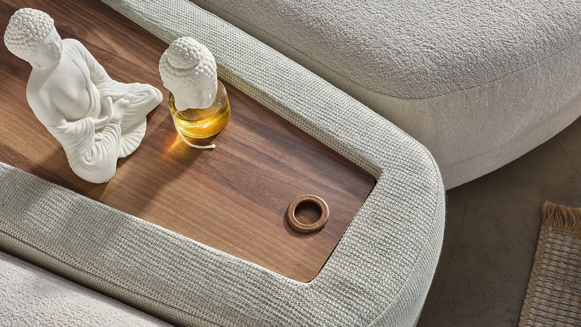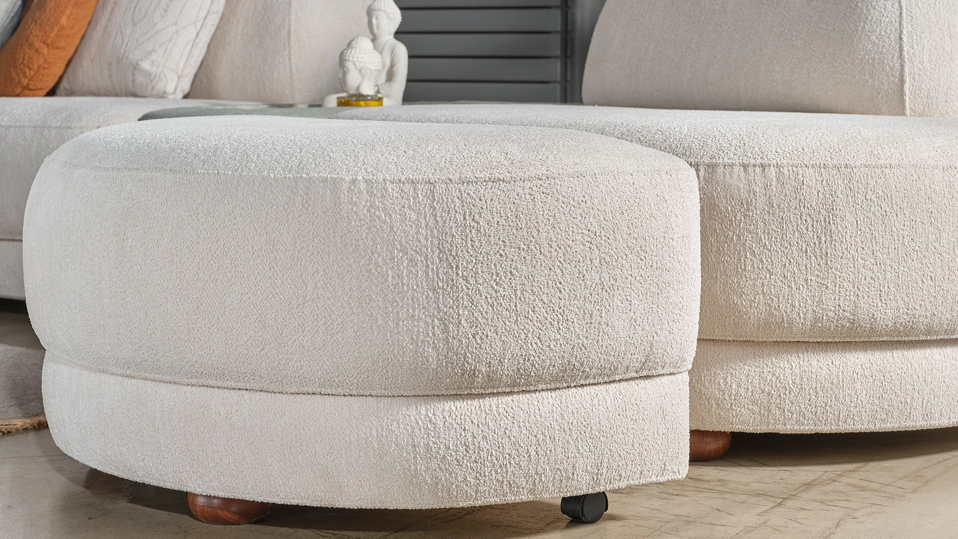 Pebble Köşe Koltuk, sıra dışı ve minimal tasarım anlayışıyla evinize şıklık katıyor. Sol Josephine koltuk, ikili modül, ara modül, sağ modül ve puftan oluşan Pebble Köşe Koltuk, krem tonlarının ferahlığı ve şönil dokunun yumuşaklığıyla, şıklığı ve konforu yaşam alanınıza taşıyor.